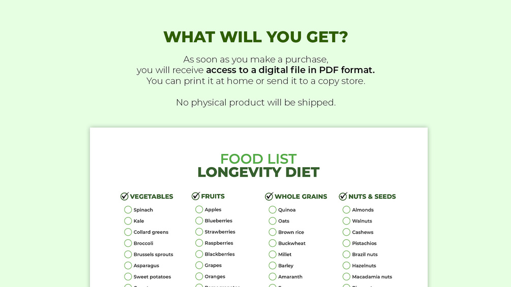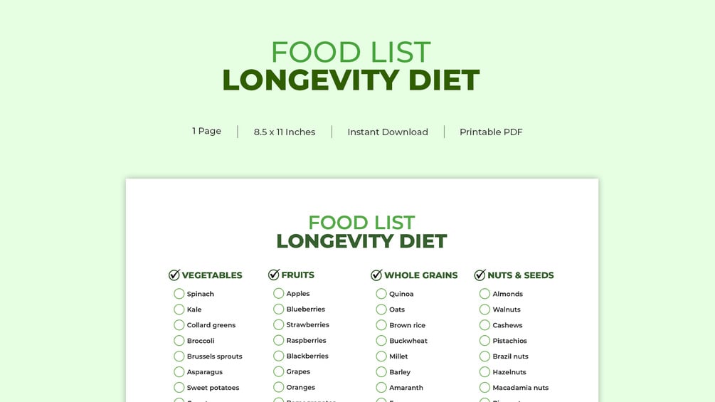 Our longevity food list helps you incorporate nutrient-dense, anti-aging foods into your diet to support overall health, vitality, and longevity.