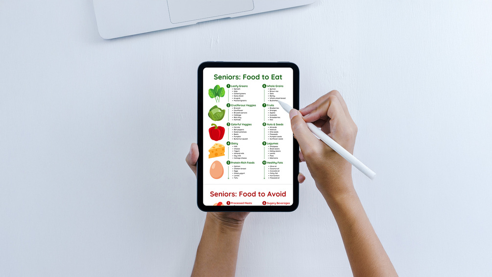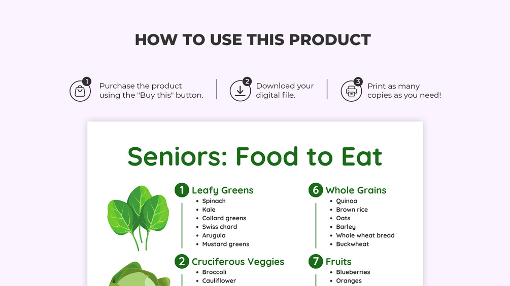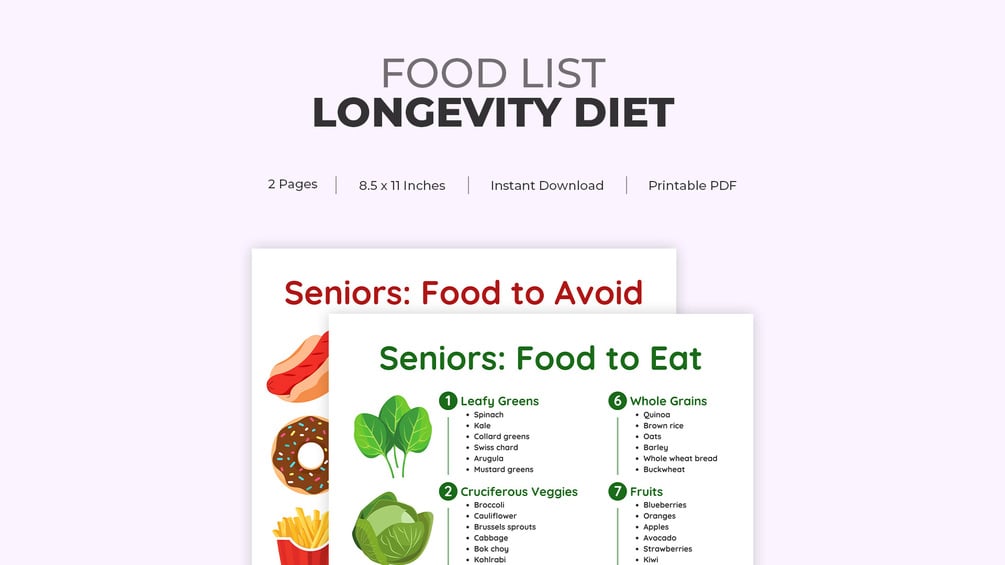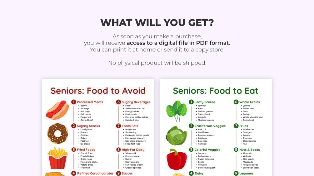 Discover 100+ Senior Foods to Eat & Avoid, a comprehensive PDF guide offering 50+ nutrient-rich foods to support healthy aging and 50+ foods to avoid for better well-being. Perfect for seniors and caregivers, it provides practical tips for a balanced diet. The digital, non-editable PDF is for personal use only, with instant access and no refunds due to its digital nature. Redistribution or commercial use is prohibited.