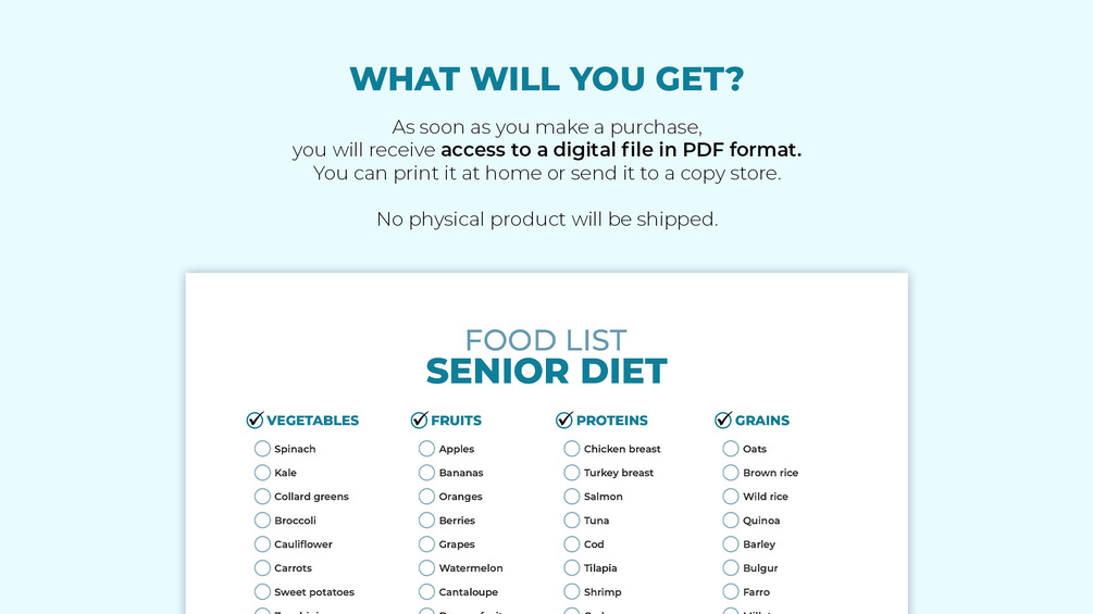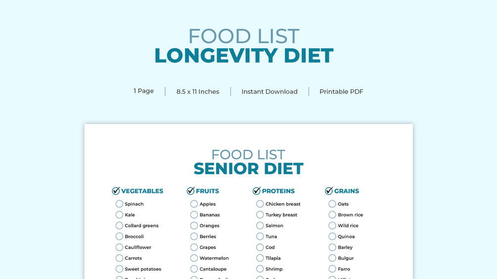 The 100+ Senior Food List is a digital resource designed to help older adults maintain energy, support heart health, and promote overall wellness by providing a comprehensive list of nutritious foods. The product is available in a high-quality, non-editable PDF format (letter size 8.5 x 11 inches) for personal use only and is available for instant digital download. It can be printed on a personal computer or through a local printing service; however, no physical product will be shipped. Due to the nature of the product, returns, refunds, and exchanges are not available.